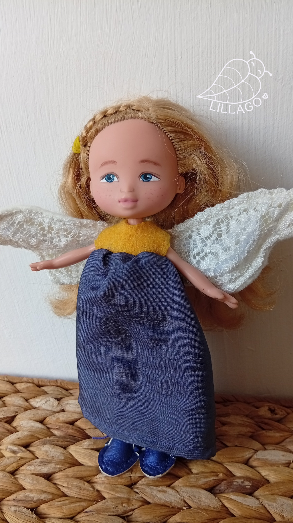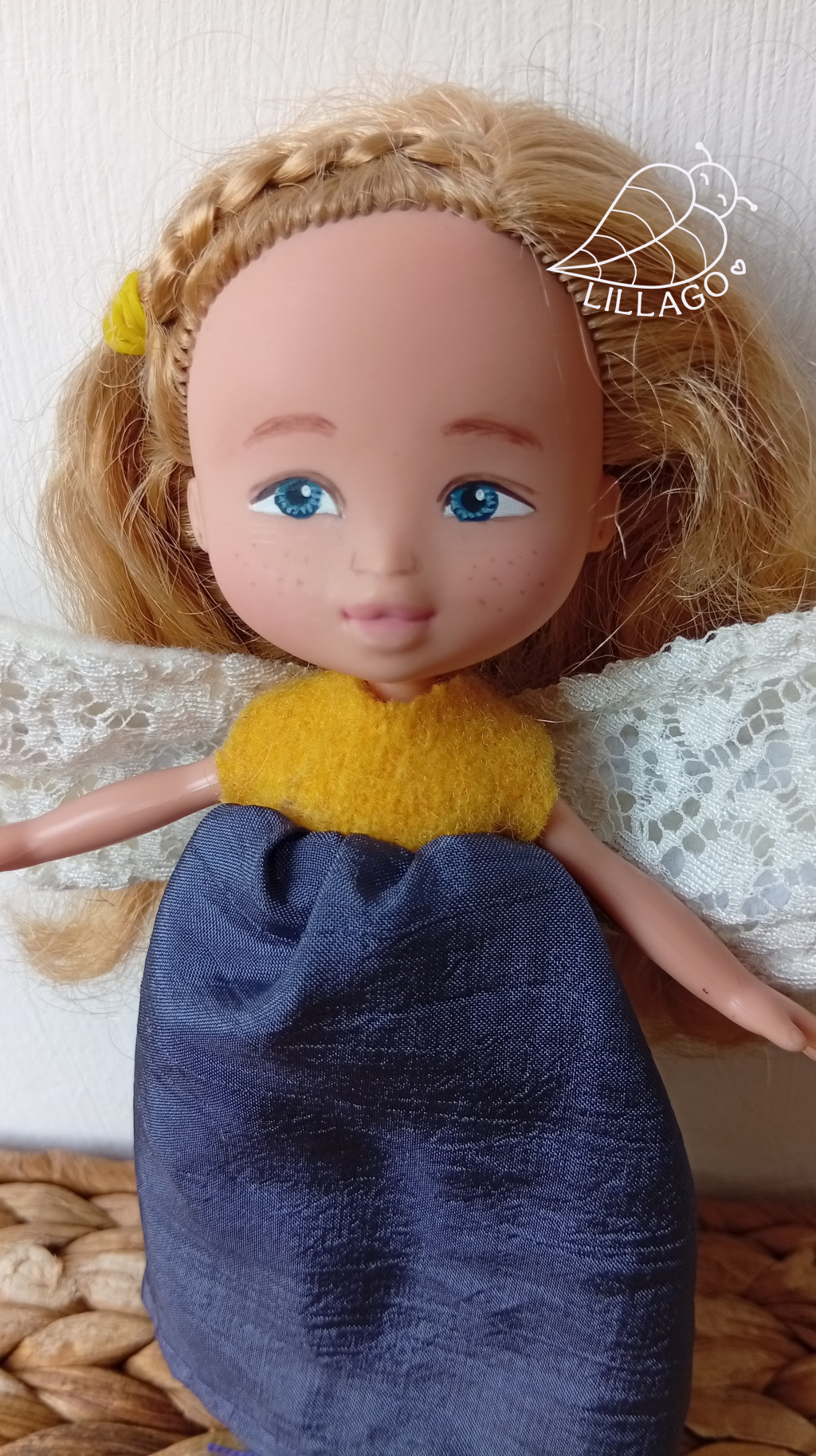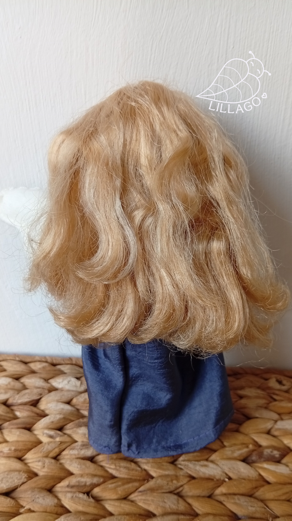 Kb 18 cm magas, dús, hosszú hajú baba.